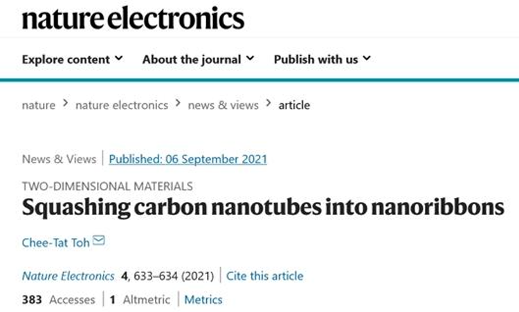 此研究工作被新加坡国立大学的Chee-Tat Toh教授在Nature Electronics期刊上以“Squashing carbon nanotubes into nanoribbons(压扁碳纳米管成为纳米带)”为题撰文进行了正面评述、肯定了该工作的重要意义;并被Physics World期刊、Phys.org、Tech Xplore、Newsbreak科技网等多个科技媒体专题报道。