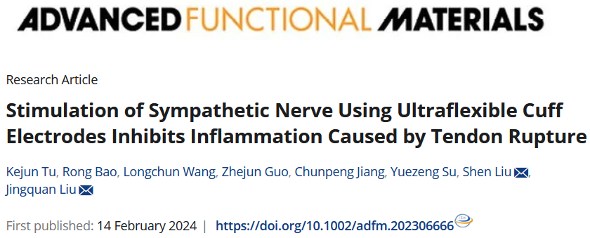 近日,电子信息与电气工程学院刘景全团队、苏跃增团队和上海交通大学附属第六人民医院刘珅主任合作,在植入式MEMS器件的炎症抑制领域取得重要进展,相关成果以“Stimulation of Sympathetic Nerve Using Ultraflexible Cuff Electrodes Inhibits Inflammation Caused by Tendon Rupture”(超薄柔性卡夫电极刺激交感神经抑制肌腱断裂引起的炎症)为题在国际著名期刊《Advanced Functional Materials》上发表。