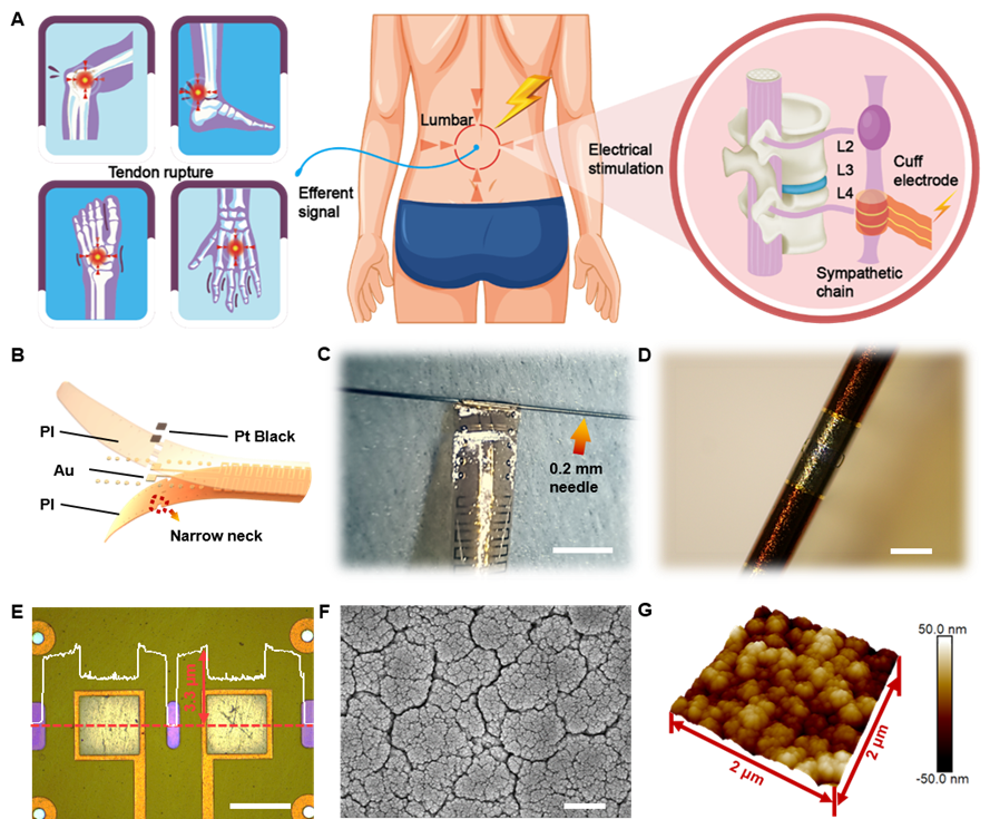 该研究基于MEMS薄膜工艺设计加工一种含有成对微电极的超薄柔性卡夫电极,通过构建小鼠肌腱粘连模型、利用小鼠腹膜后间隙微创电极植入术,实现电极与交感神经(最大直径约0.2 mm)的超柔顺自贴敷和高效脉冲电刺激、电记录。不同于传统的卡夫电极,该研究采用了超薄微纳加工工艺,使得电极的整体厚度≈3um,无需额外的固定即可实现电极和超细外周神经(<0.2 mm)的紧密包裹,并且未对周围神经和组织造成不可逆损伤。为了提高电极在电刺激、电记录过程中的可靠性和安全性,在微电极表面修饰铂纳米材料,改善其电化学特性,从而有利于器件的长期使用,促进其临床转化。
