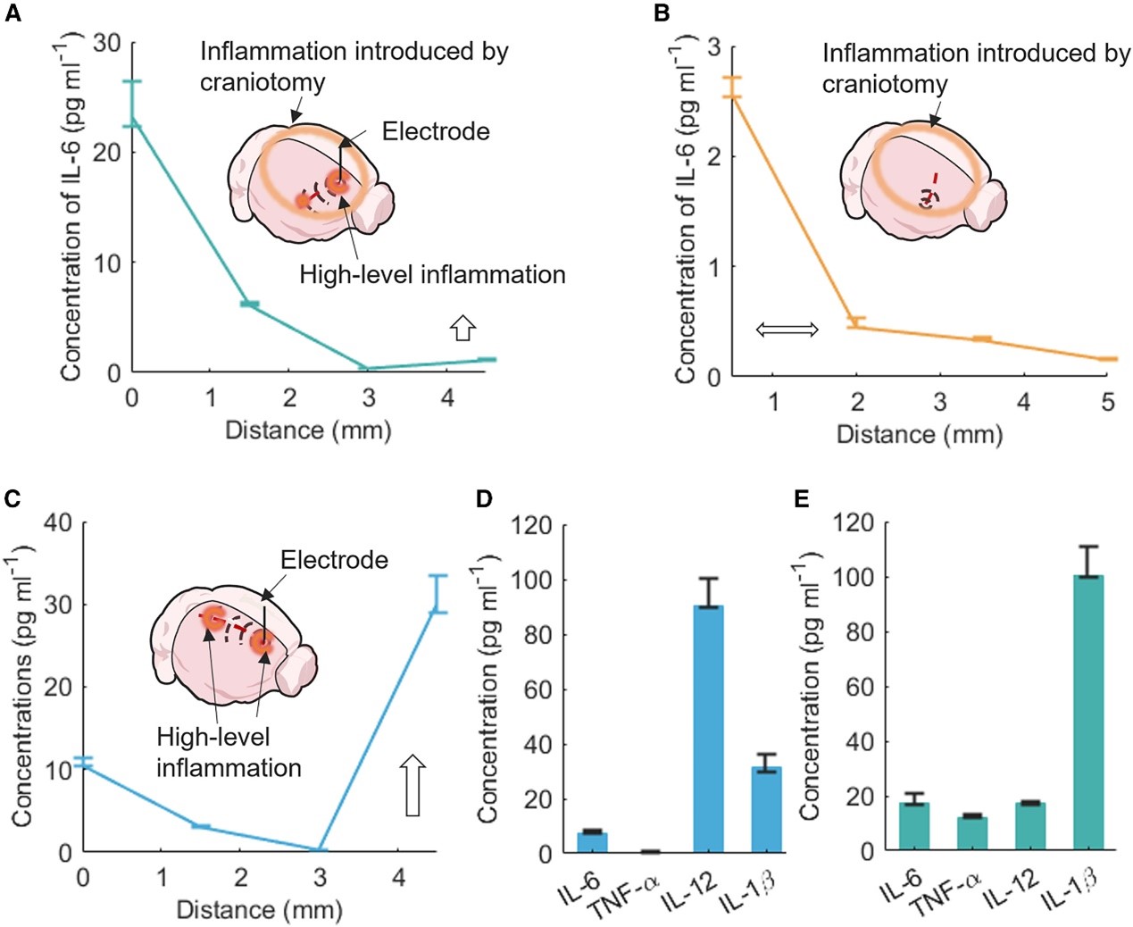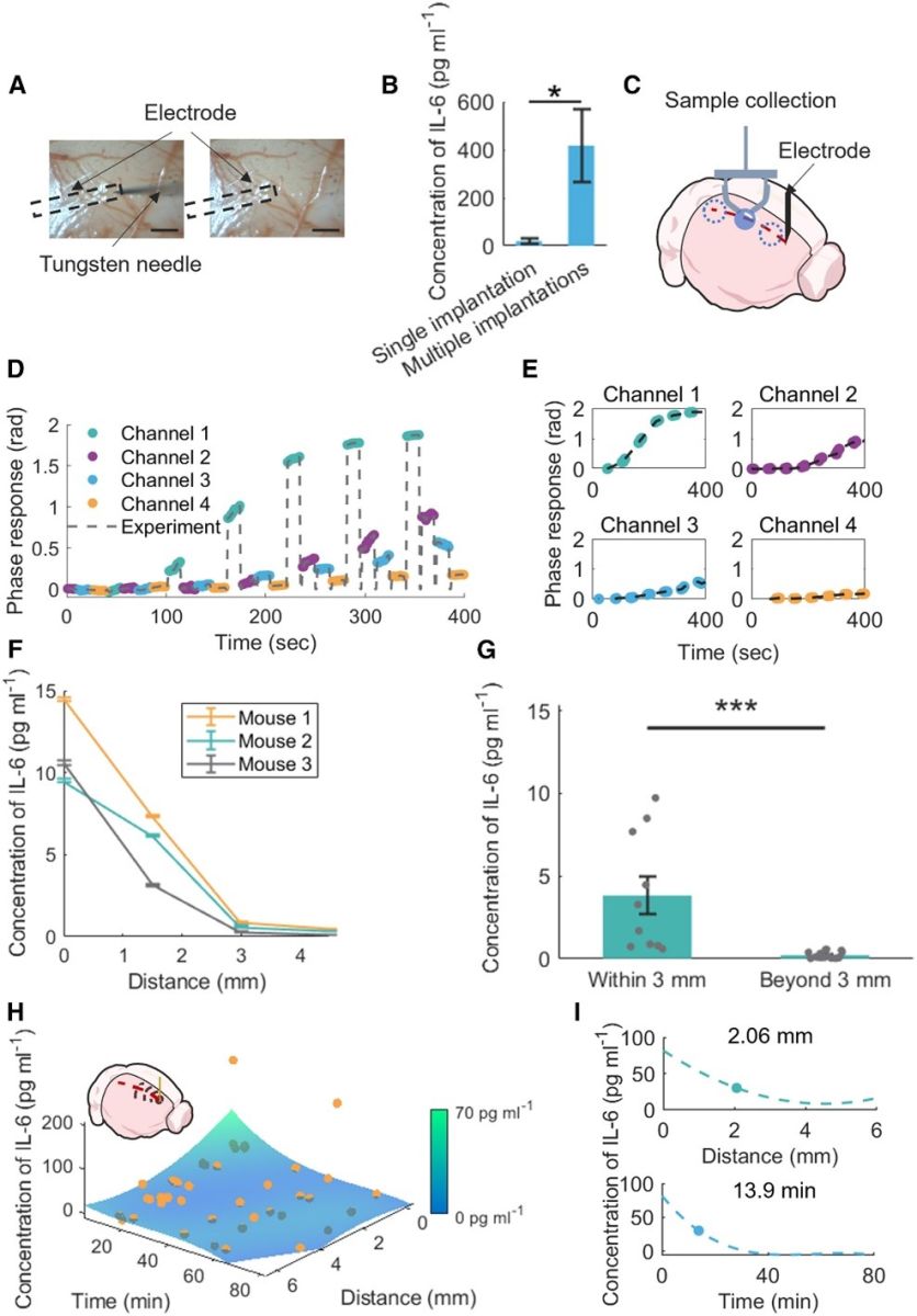 ISAID系统具备两种独立的检测模式,可分别实现多样本高通量分析或多细胞因子同步检测。本研究借助该系统,在小鼠模型中系统解析了神经电极植入所引发的急性炎症反应。实验结果显示,植入后的瞬态炎症反应具有明确的时空分布规律:其在小鼠脑组织中呈现约13.9分钟的衰减时间常数,并伴随2.06毫米的特征扩散距离。更重要的是,ISAID能够及时发现特定脑区的高炎症异常,并且可在指定脑区位置同步定量多种炎症生物标志物以明确异常炎症的多维发展状态。