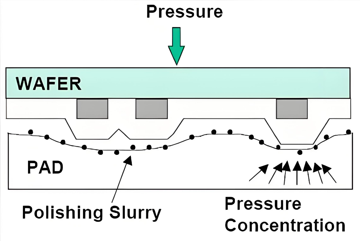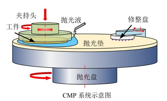 在抛光过程中,晶圆通过抛光头(夹持头),按照给定压力作用在贴有抛光垫的旋转抛光盘上,同时相对自身轴线做旋转运动以及相对抛光盘做往复摆动运动。