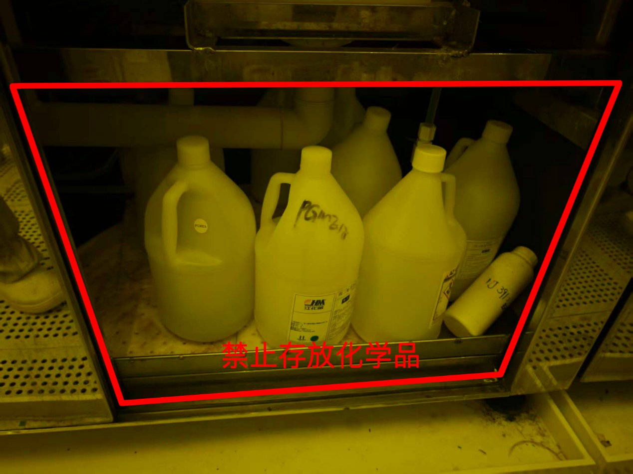 本次清查覆盖西区净化室内所有化学品,其中化学品存放柜、化学品存放冰箱、有机湿法区、涂胶机与显影区操作台下方区域为重点清查区域。