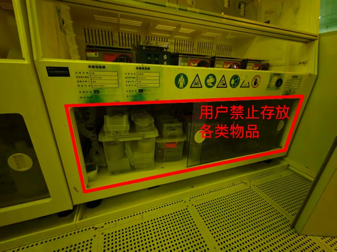 5. 储物盒存放要求:储物盒须整齐放置在指定位置(净化室走廊储物盒置物架上),严禁在实验台、桌面、地面等非指定区域随意存放储物盒。严禁用户在操作台内(包括操作台下方区域(如光刻区热板操作台下))存放储物盒。