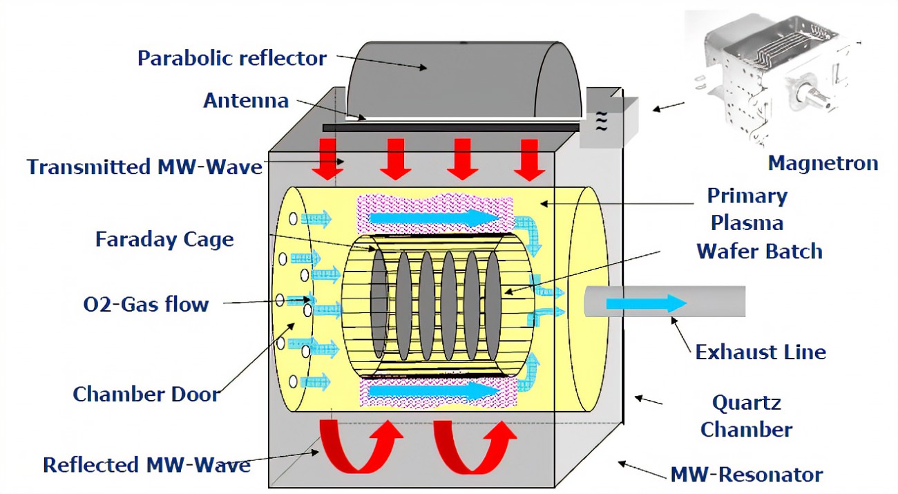 在石英材料的腔室中,抽真空后通入适量的氧气,在微波电源的高频电磁场激励下,氧气被电离成O2-,O2+,O-,O+,O,臭氧等活泼的等离子体,在高频电场的辅助下可以和基片表面的光刻胶或其他有机材料发生氧化反应,生成CO、CO2、H2O等易挥发的物质,被真空泵抽走,从而实现去胶的目的,其原理如图所示。
