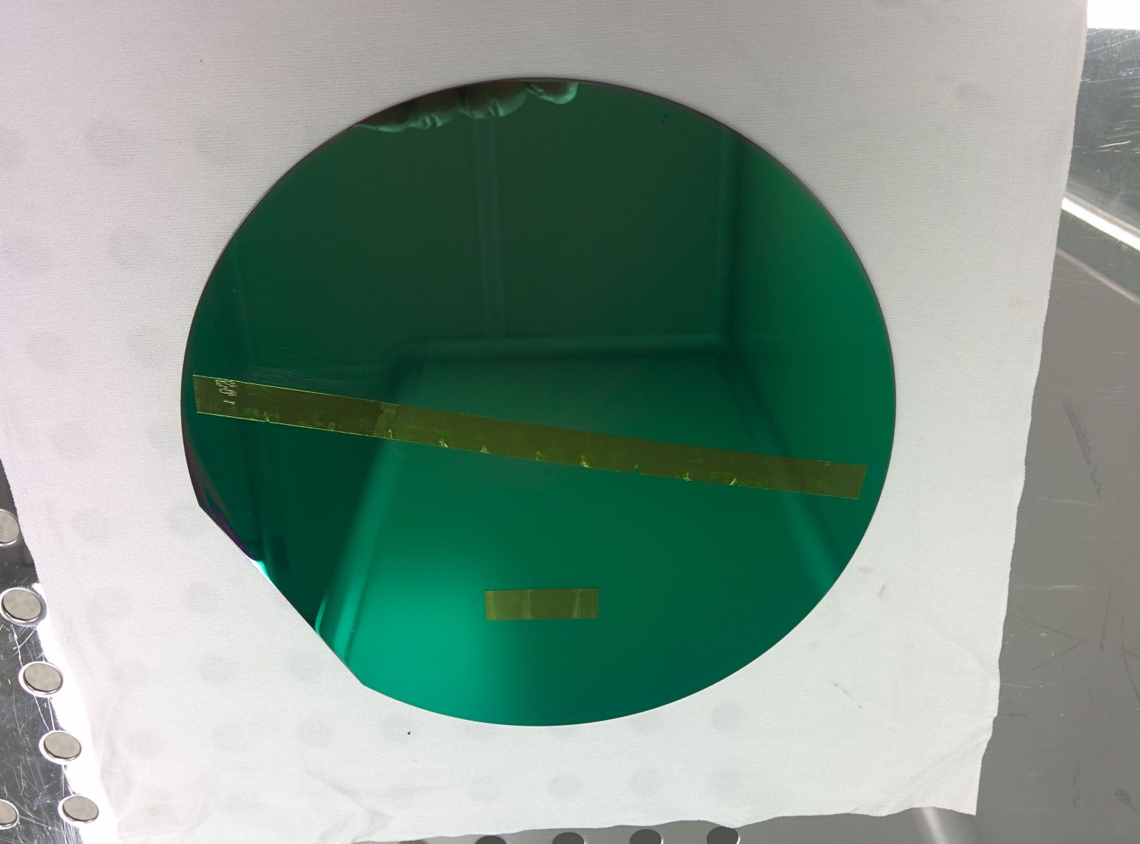 此为涂布了光刻胶的6寸硅片,为方便观察,用高温胶带进行了标记;