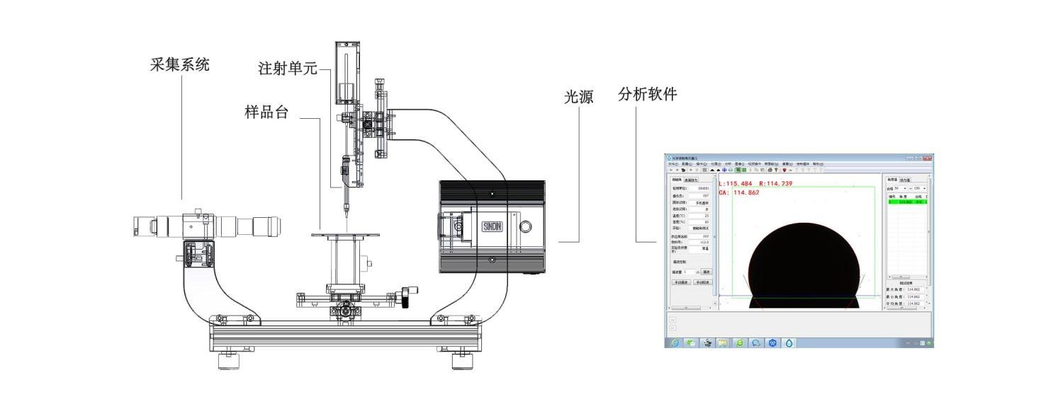 如上图,接触角测量仪主要由光源、注射单元、样品台、采集系统、分析软件五大部分组成,设备采用光学成像的原理。 光源采用密集LED冷光设计,发光均匀,图像清洗,寿命长; 注射单元采用高精度注射泵进液,由软件定量定速控制,滴液稳定,精度高达0.01微升; 样品台采用三维手动精调平台,操作灵活,定位准确,样品台可根据实际样品尺寸定制; 采集系统采用黑白进口CCD相机,拍摄稳定,图像清晰,真实可靠,镜头采用德国工业级进口配置,0.7-4.5倍放大可调,成像无畸形失真