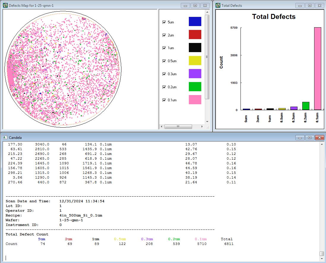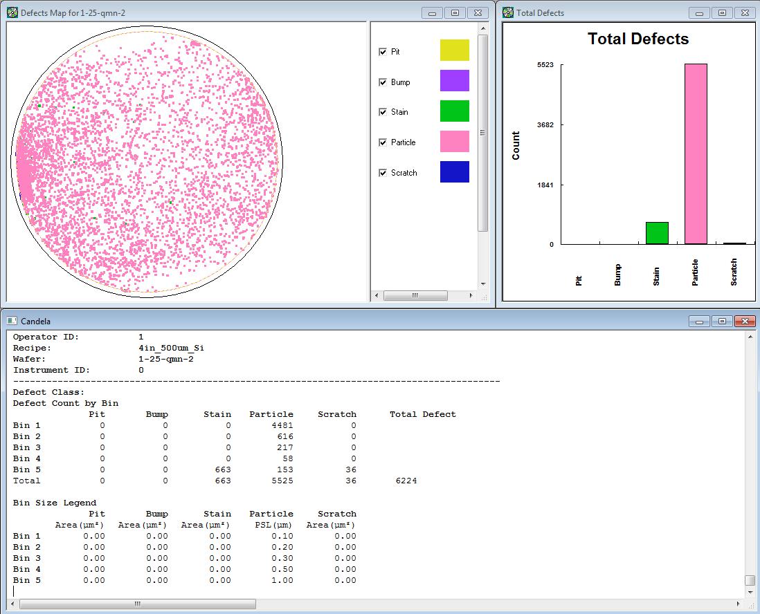 | 功能: | 用于晶圆表面缺陷的检查与分析,快速将缺陷(包括微粒、划伤、坑点、水渍、痕迹残留等)进行分类,统计每一种缺陷的数量并且量测出相应的缺陷尺寸,最后给出整个表面的缺陷分布图以及检测报告。根据预先设定的缺陷标准,可以给出检测样品合格与否的判定。 |