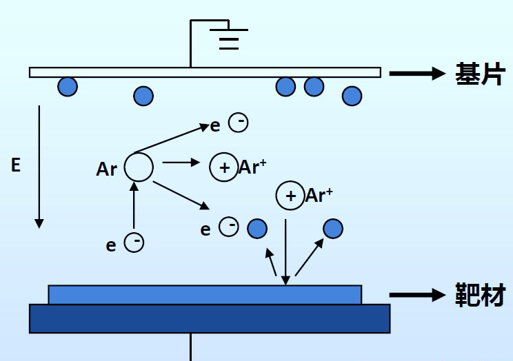 Ar⁺离子在电场作用下高速轰击靶材表面,使靶材原子脱离并溅射。