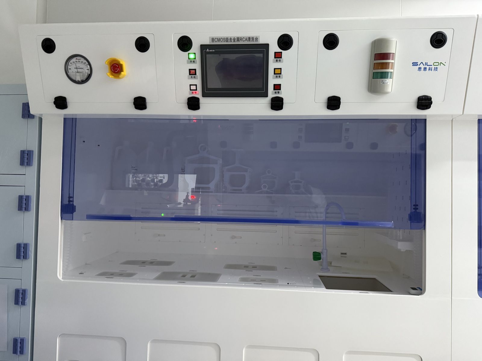 | 功能: | 该设备配置2套不同尺寸的槽体,可以用于8~6寸以及4~3寸两种类型的晶圆的金属湿法刻蚀工艺, 槽体最多可以进行5片硅片的工艺处理, 可以通过SC2槽以及DHF槽溶液进行金属湿法刻蚀清洗的各个工艺步骤。 |